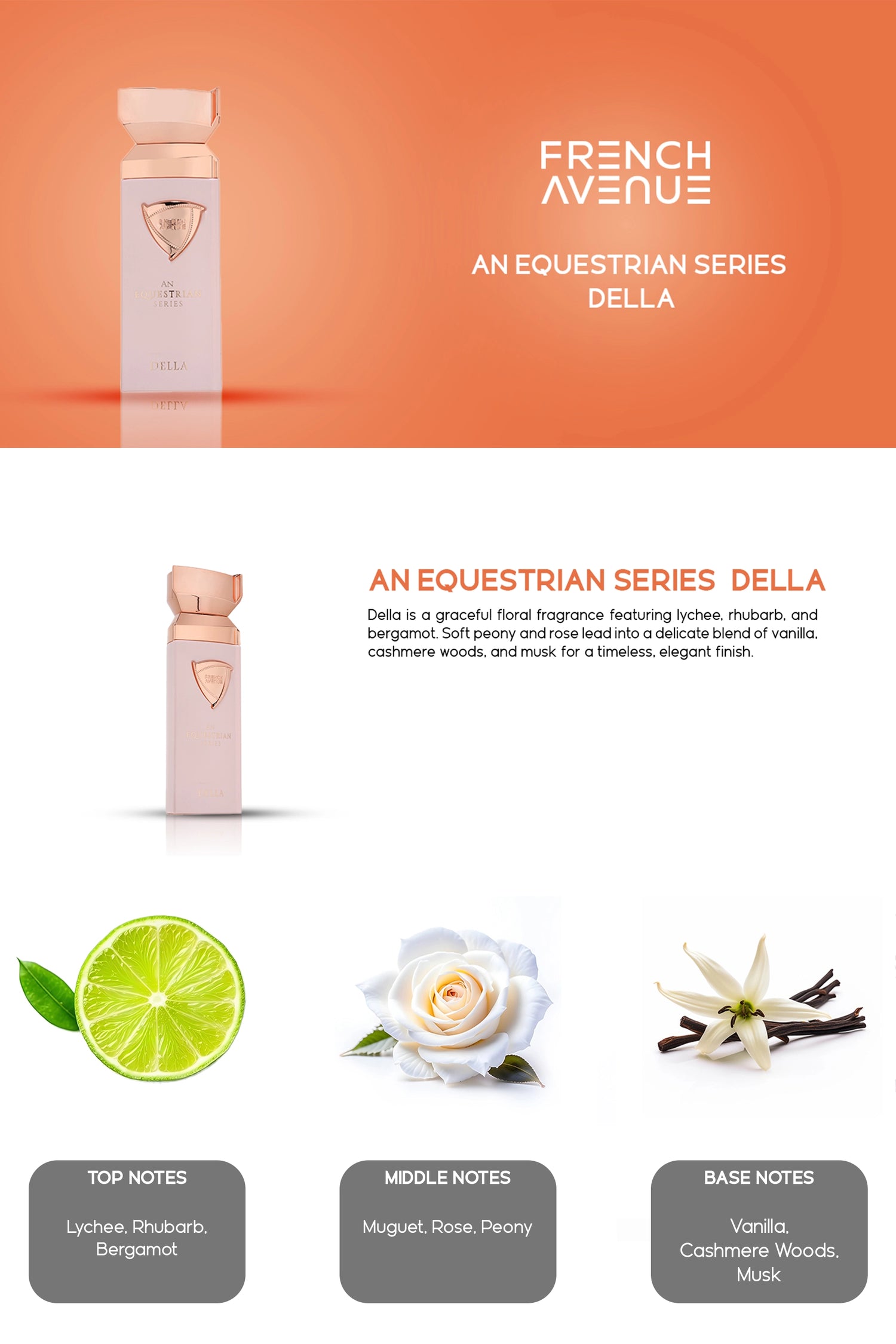 Envelop your senses in An Equestrian Series Della, an exquisite floral fragrance highlighted by captivating notes of lychee, rose, musk. This strong intensity scent invites you into a personal moment of sophistication and elegance, evoking a sensory experience uniquely yours.