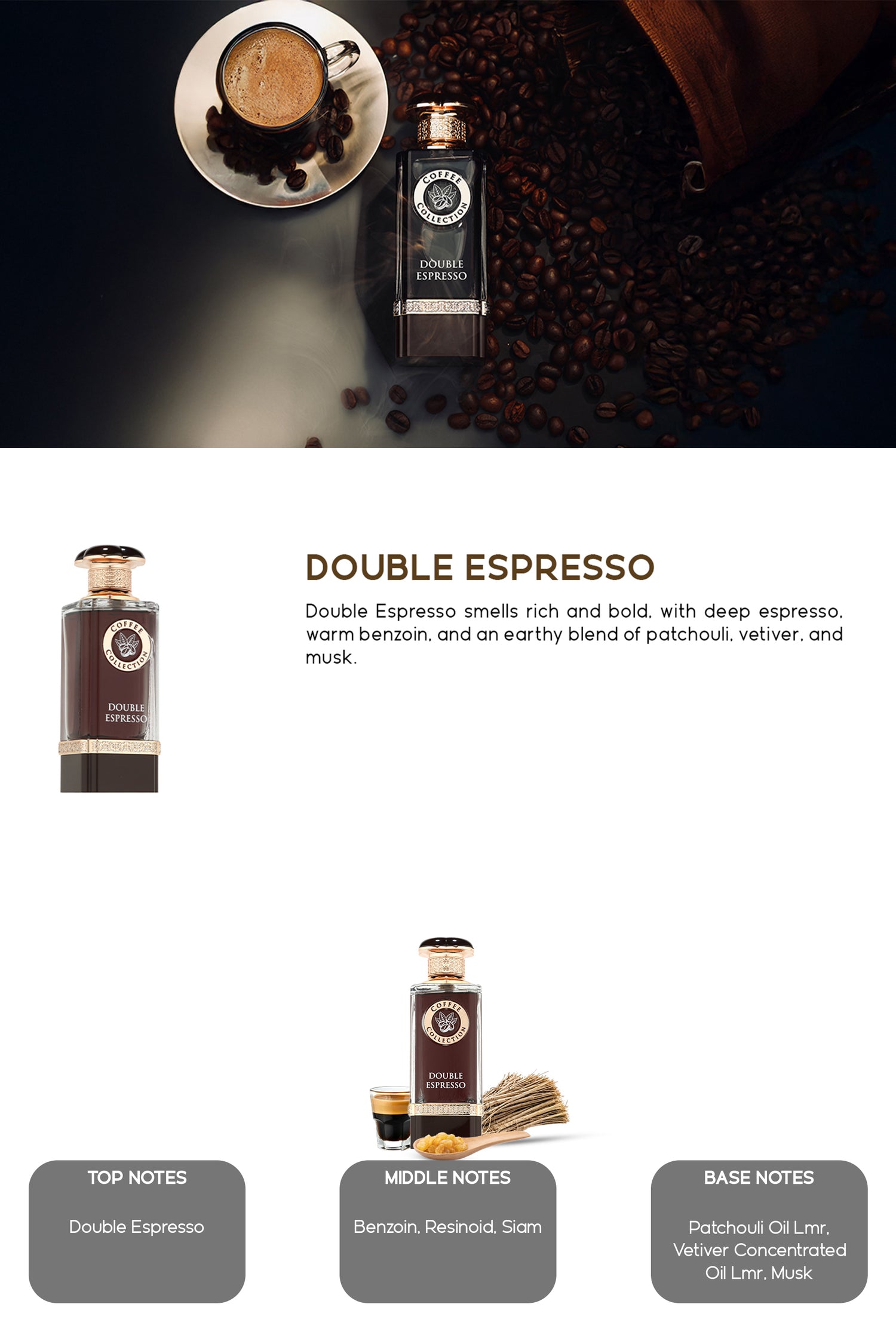 Envelop your senses in Double Espresso, an exquisite oriental - woody fragrance highlighted by captivating notes of double espresso, benzoin, musk. This strong intensity scent invites you into a personal moment of sophistication and elegance, evoking a sensory experience uniquely yours.