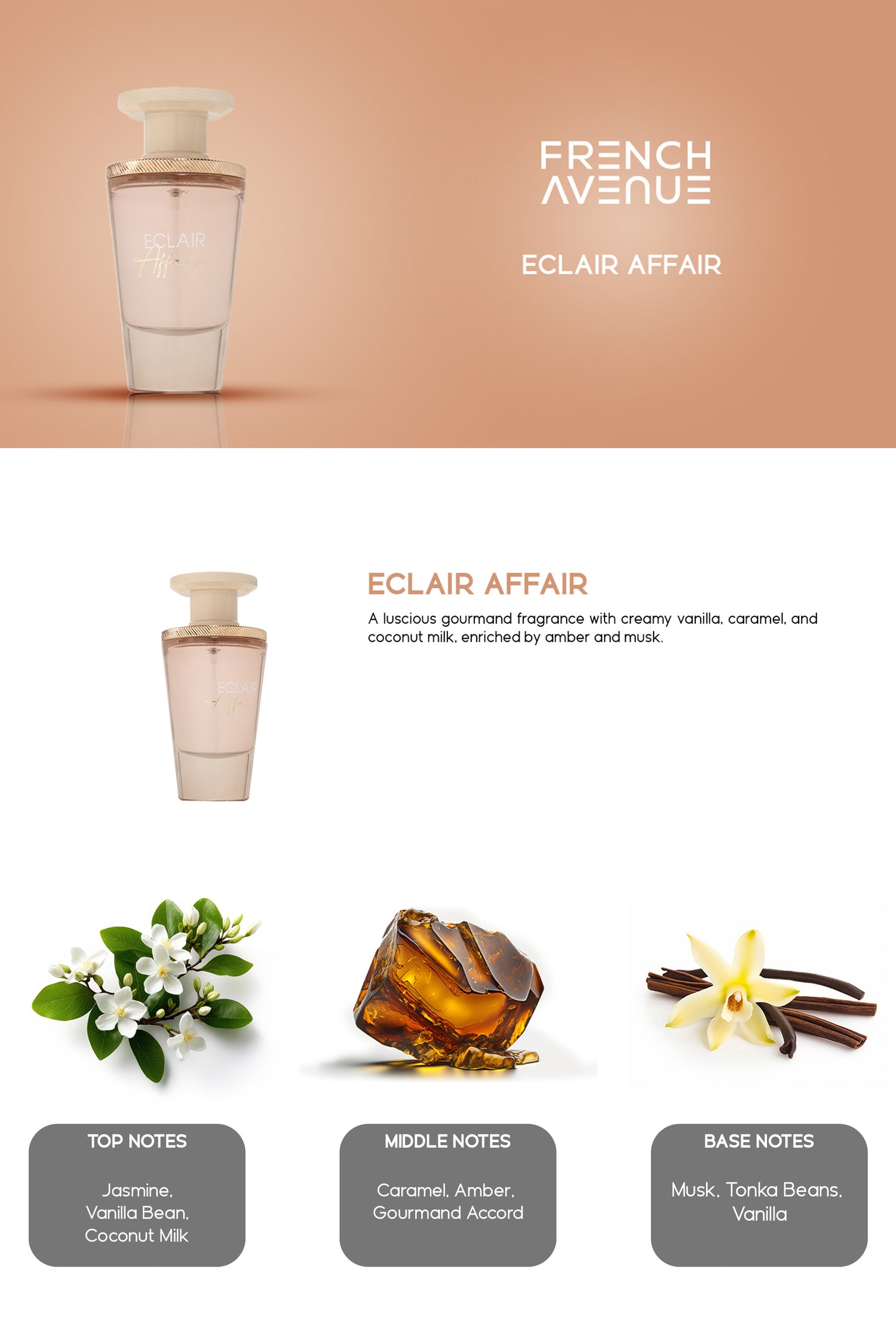 Envelop your senses in Eclair Affair, an exquisite gourmand fragrance highlighted by captivating notes of coconut milk, caramel, vanilla. This strong intensity scent invites you into a personal moment of sophistication and elegance, evoking a sensory experience uniquely yours.